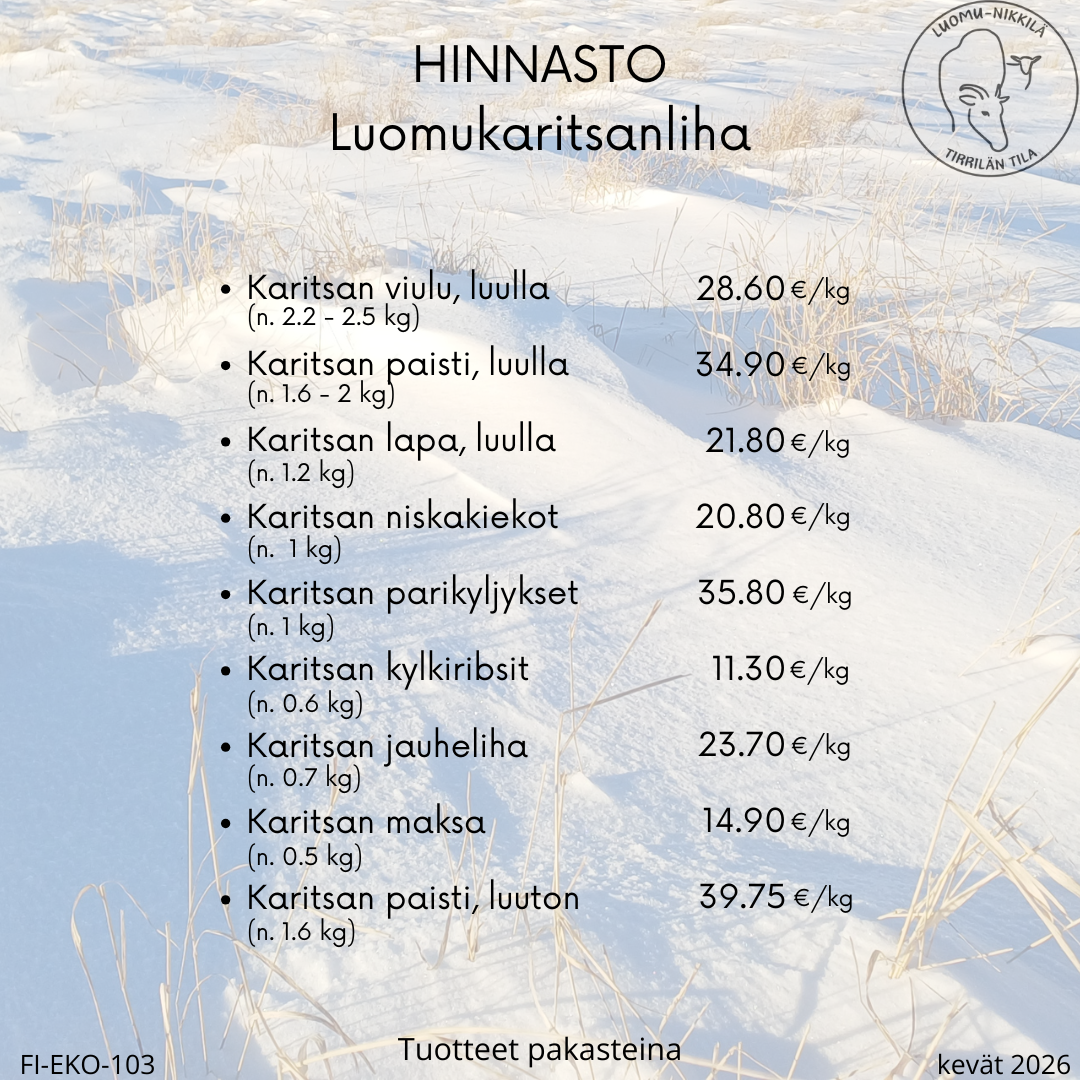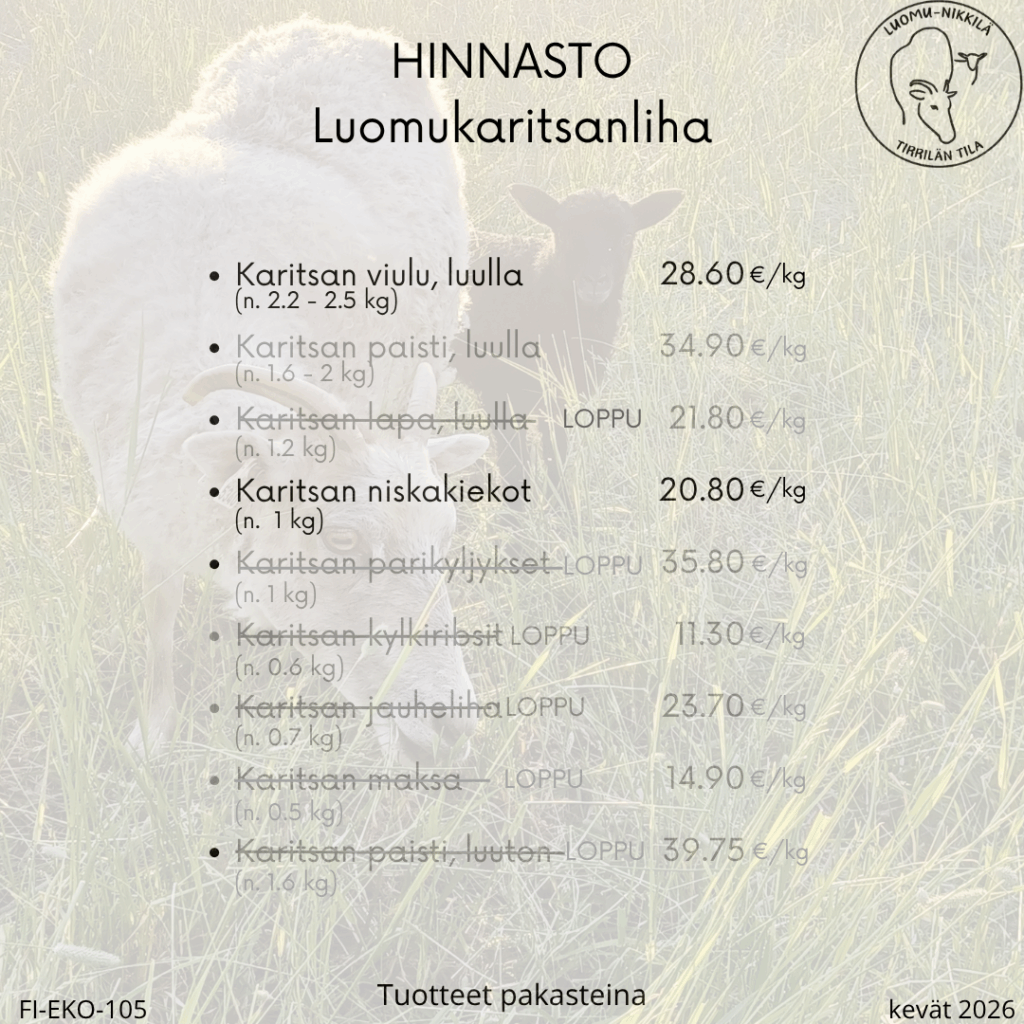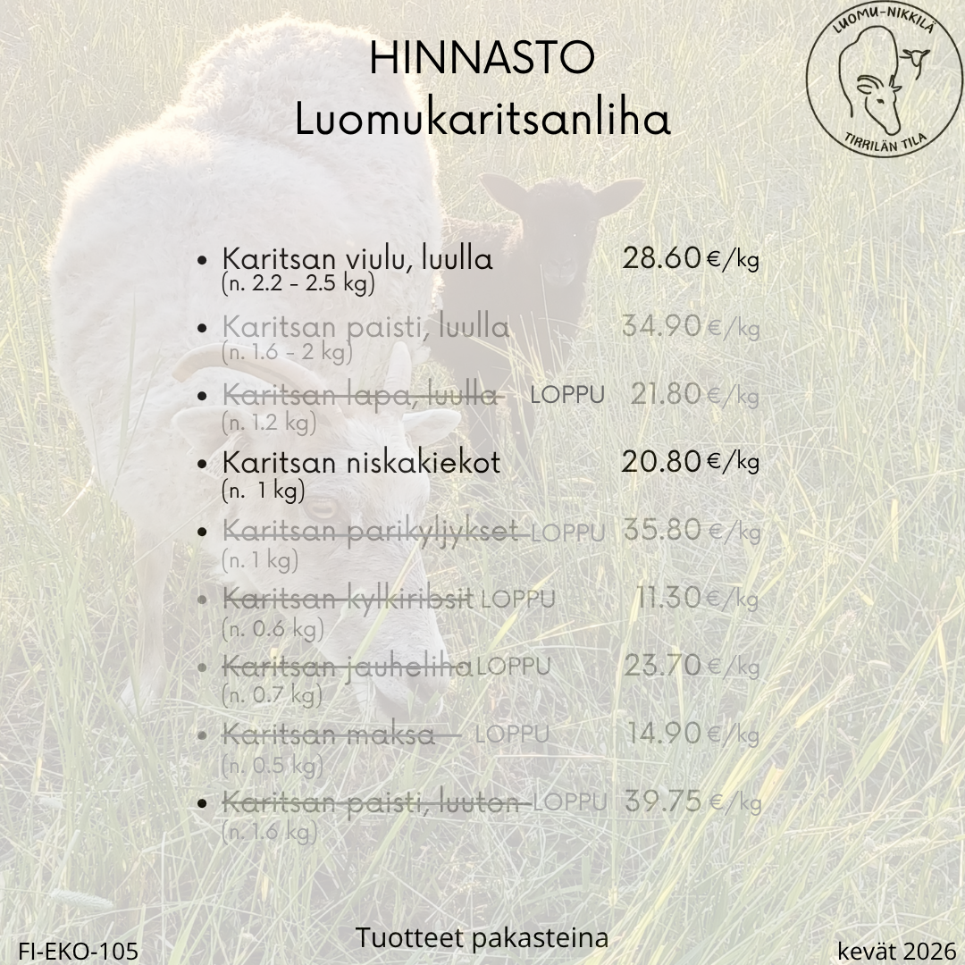 Kevään karitsanlihat tulevat myyntiin viikolla 12 (16.3. alkavalla viikolla) ja hinnastokin julkaistaan ihan lähipäivinä. Näillä näkymin tarjoamme lihaa Tampereen reko-jaoissa sekä Iittalan rekossa, ja toki tilamyymälästä voi noutaa. Huom! Pieni erä!