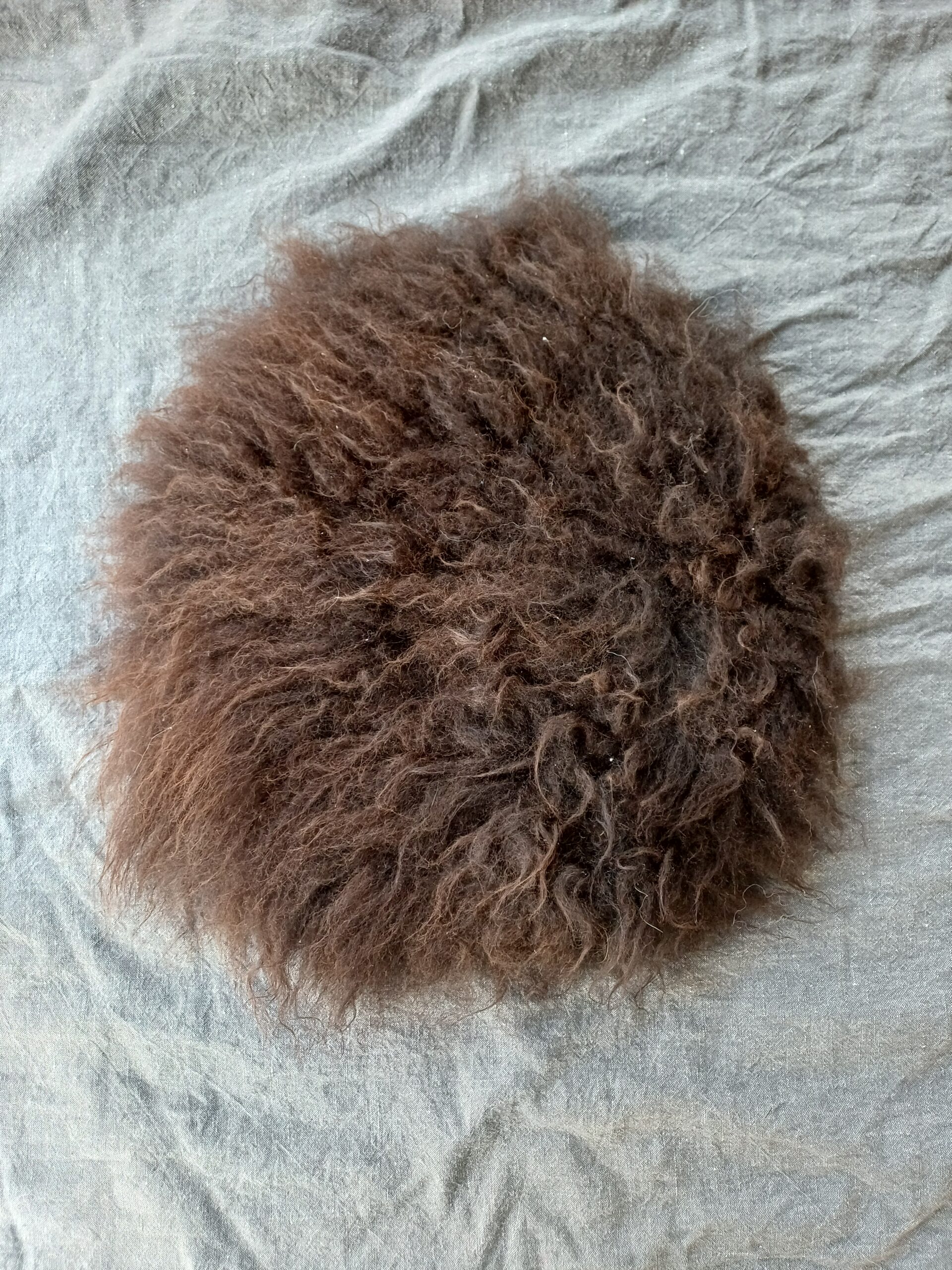 Pyöreä istuinalusta, musta, halkaisija noin 33 cm. Istuinalusta on valmistettu aidosta, kasviparkatusta lampaantaljasta. Pörröinen villa.