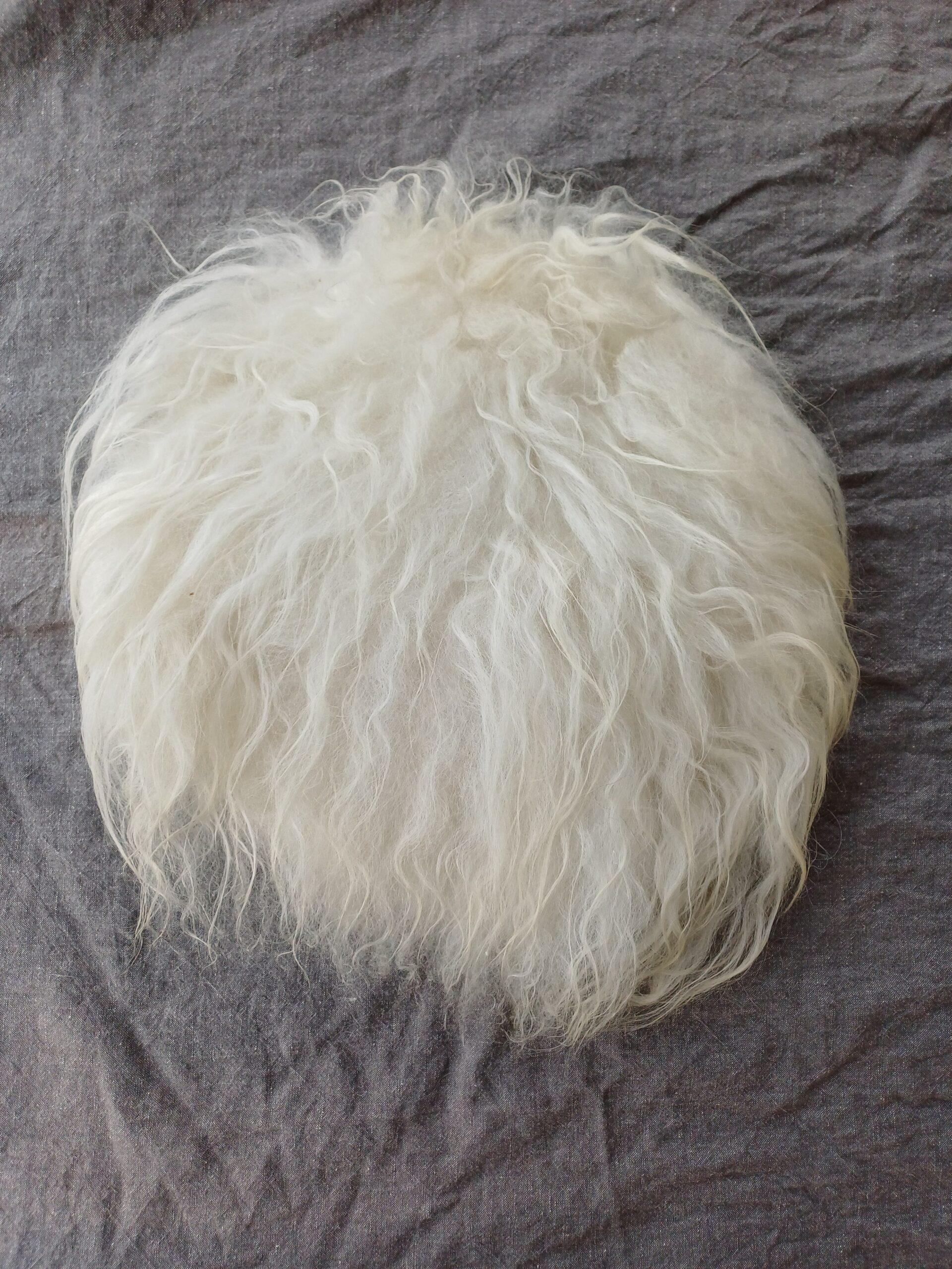 Pyöreä istuinalusta, valkoinen, halkaisija noin 33 cm. Istuinalusta on valmistettu aidosta, kasviparkatusta lampaantaljasta.