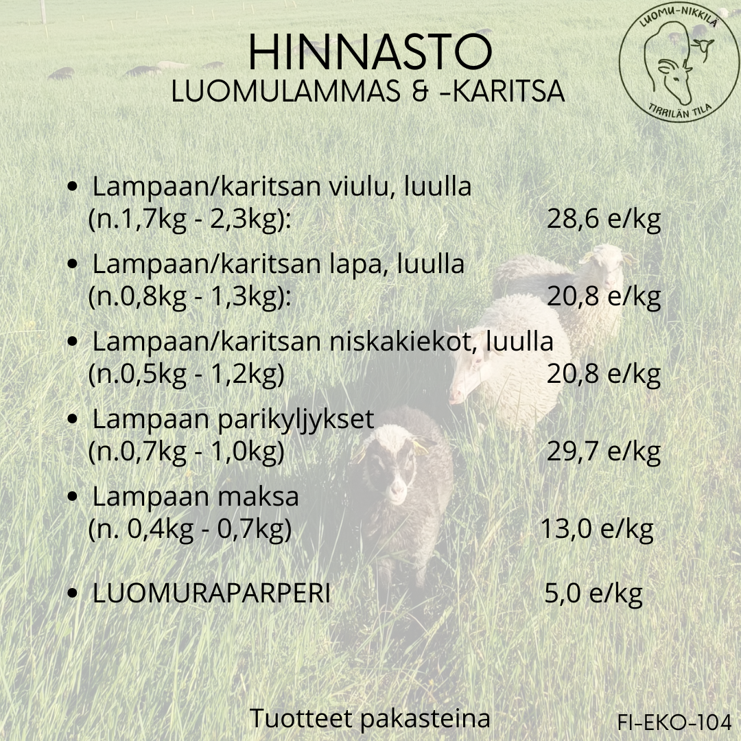 Torstaina 21.8. tarjolla luomutuotettua karitsan- ja lampaanlihaa. Tilauksia otamme vastaan 20.8. klo 23:00 asti. Maksut MobilePayllä tai käteisellä. Kaikki tuotteet ovat pakasteina, hinnasto ja tuotelistaus löytyy täältä.