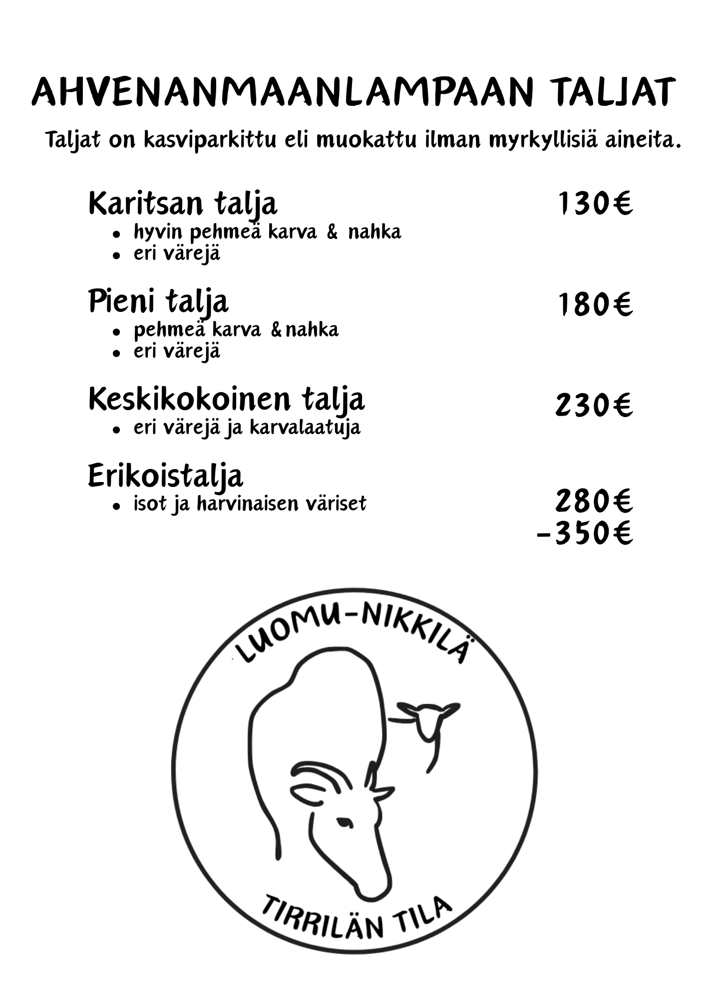 Tilaltamme saa ahvenanmaanlampaan taljoja. Taljat ovat luomulampaista ja ne on kasviparkattu Viron Skineks muokkaamolla. Taljat ovat kukin omanlaisiaan, kahta samalaista ei löydy!